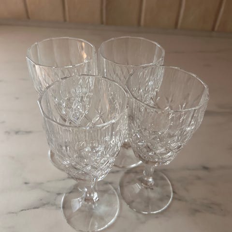 4 klassiske krystall vinglass. Tror det er Val St. Lambert, men ikke helt sikker siden de ikke er merket. 19cm høye, ikke bruksspor.