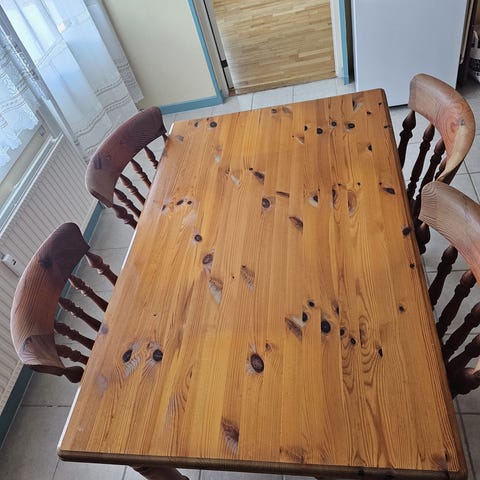 Selger 4 stoler i tre. De er godt brukt, men litt pussing og/eller malingstrøk blir de som nye.