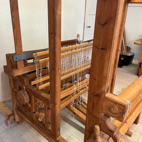 Vevstol i tre med tilbehør. Stor gulvvev med sveiv og flere skaft, egnet til veving av tepper, løpere og andre tekstiler. Bildene viser ulike deler av veven, inkludert renning, skaft, skje og diverse løsdelelementer som skyttel og ekstra trestaver. Passer for den som ønsker en tradisjonell, manuell vevstol til hobby- eller håndverksbruk.