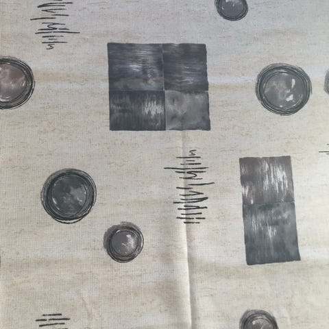 Stoff i beige med hint av gult. Stoffet har en lett struktur i veven som gir et diskret, melert uttrykk. Egner seg som gardin, duk, puter eller til møbler, et fast og solid stoff i polyester. 136 cm bred og 96 cm lang. Selges kr 60.