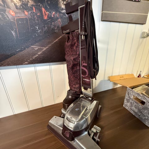 Kirby G4 støvsuger med flere tilbehørsdeler. Modellen er en tradisjonell gulvstøvsuger med støvpose og slange. Bildene viser ulike munnstykker, børster og rør, samt ekstra støvsugerposer. Egner seg til rengjøring av gulv og andre overflater i hjemmet, avhengig av hvilke munnstykker som brukes. Alle deler som følger med er vist på bildene. Kan leveres eller sendes etter avtale.