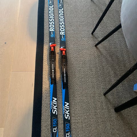 Rossignol R-Skin langrennski med integrert fell under sålen. Skiene har Rottefella-bindinger montert. Med følger et par Fischer langrennsstaver.