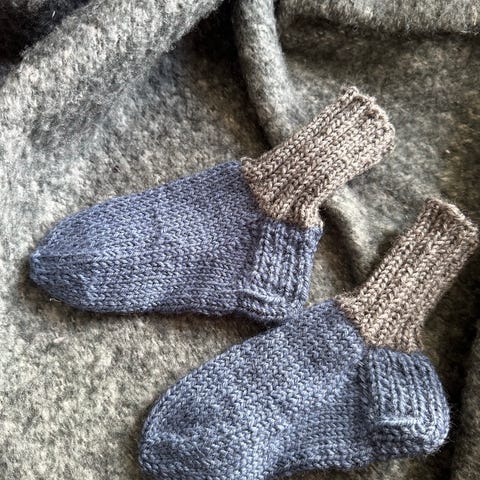 Selger hjemmestrikket ull sokker. Unisex farge Blå og grå. Se bilde for størrelse i cm. Det er strikket med 100% ull, superwash i vrangborden og vanlig ull i sålen.