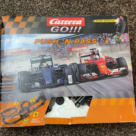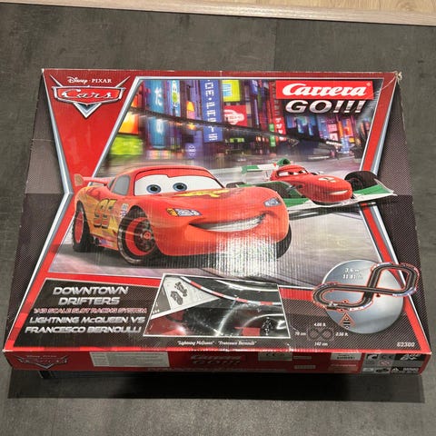 Disney Cars Carrera GO bilbane med motiv fra filmen Biler. Settet inneholder bilbane med rette og buede skinner, strømtilkobling, håndkontrollere og to racerbiler, blant annet Lightning McQueen. Bilbanen er egnet for barn som liker bilracing og Disney Cars-universet. Passer til innendørs lek på gulv eller bord. Kontrollere og biler er tilpasset Carrera GO-systemet.