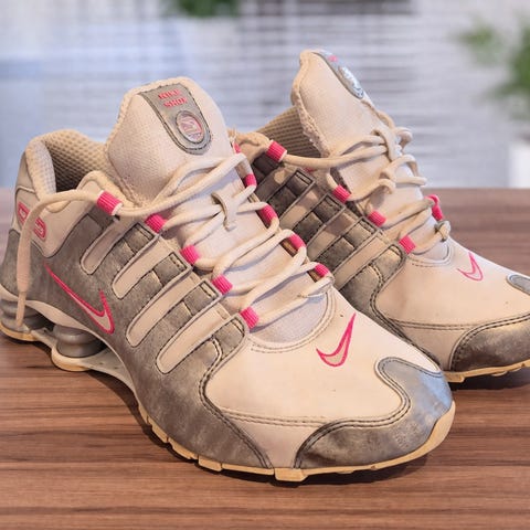 Nye Nike sneakers i størrelse 39. Skoene har hvit og gullfarget overdel med mønstret tekstil og syntetiske detaljer. Lissesnøring foran og hempe bak på hælen for enkel av- og påkledning. Yttersåle i gummi med røde felter og mønster for grep. Passer til hverdagsbruk og lett fritidsaktivitet.