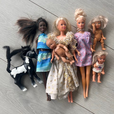 Barbie dukker og tilbehør. Settet inneholder flere Barbie-dukker, kledd i ulike antrekk, samt ekstra klær og sko i ulike farger og stiler. I tillegg følger det med hestefigurer med sal ( kun hest med orange Grime) og hodelag, samt annet tilbehør som vesker, møbler og smådeler til lek. Vaskemaskin med tilbehør. Egnet for barn som liker rollelek og fantasilek med dukker og dyr.