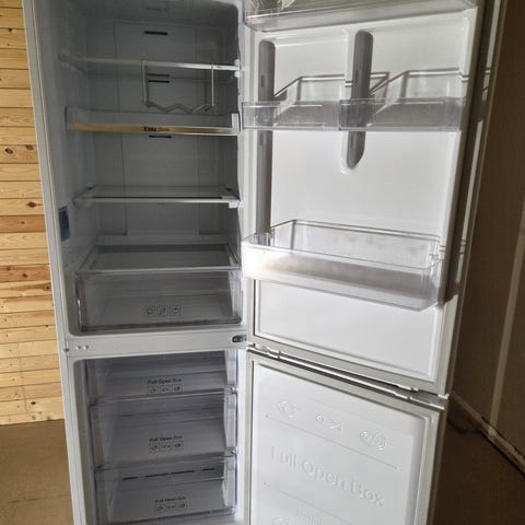 Kjøledelen har flere justerbare glasshyller, dørhyller og grønnsaksskuffer for organisering av matvarer. Frysedelen nederst har tre gjennomsiktige skuffer for oversiktlig lagring av frossenmat.
