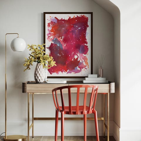 Maleriet har et abstrakt, figurativt motiv med en sentral menneskefigur omgitt av blomster, fugler og organiske former. Fargebruken er kontrastfylt med sterke og dempede toner i flere lag. Bildet har et ekspressivt preg med tydelige konturer og tekstur i overflaten. Passer som veggkunst i stue, gang eller andre oppholdsrom der man ønsker et blikkfang med kunstnerisk uttrykk.