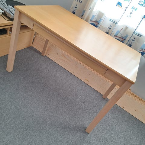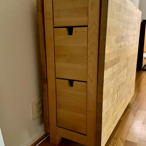 IKEA spisebord i tre med uttrekkbar bordplate. Bordet har massiv treoverflate med synlig trestruktur. Under bordplaten er det integrert oppbevaring med skuffer på siden. Uttrekksløsningen gjør at bordet kan brukes både som kompakt bord og som større spisebord ved behov. Bordet har to sprekker på beina, som vist på bildet, og det er også synlige tegn på slitasje. Frakt er tilgjengelig mot et tillegg i prisen.