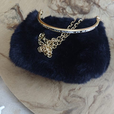 Zara skulderveske for dame i stoff, dekorert med perlelignende kuler på utsiden. Vesken har en metallkjede som skulderreim og en ekstra kort hank med perler. Innvendig er det et fôr i lyst stoff med åpen hovedlomme. Egnet som liten veske til å bære nødvendigheter som mobil, nøkler og småting. Str ca 20x20 cm, selges kr 150,- pluss evt frakt.