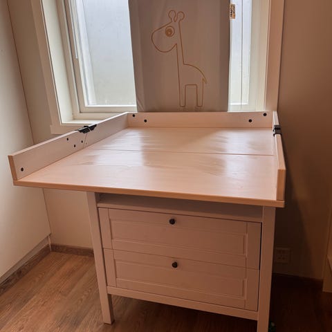 Stellebordet gir lagringsplass til bleier, kluter og annet utstyr på hyllene under. Passer til standard stellematte i tilsvarende størrelse, som vist på bildene. Det er synlige bruksspor på kantene av bordplaten, som vist på nærbildet. Ellers fin stand.