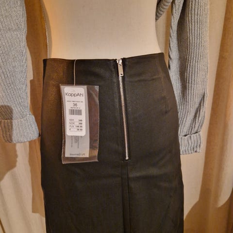 KappAhl skinnskjørt for dame i størrelse XS. Skjørtet er svart og laget i skinnmateriale med glatt overflate. Nytt med lappen på. Noe romslig i størrelse, vil si det passer bedre en s.