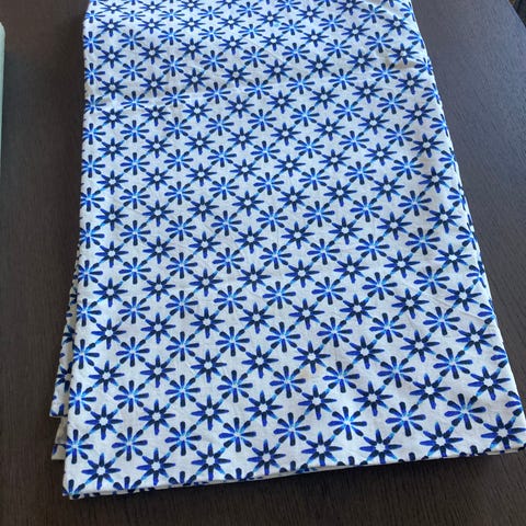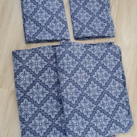 IKEA tekstil med mønster i geometrisk design. Farger i blå, hvitt med litt gult. Stoffet har gjentakende ruter og dekor langs kanten. Kan brukes til ulike syprosjekter eller som interiørtekstiler som duk, gardin eller putetrekk. 2 putetrekk og et dynetrekk til dobbelt dyne.