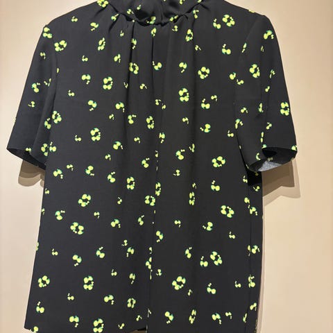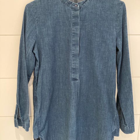 COS topp, dame i størrelse M. Blusen er mørk marine blå og laget av polyester. Modellen har rund hals, trekvart til lange ermer og lett innsvinget liv med rynker som gir en løs og komfortabel passform. Åpning i ryggen med knyting øverst og knappelukking i midjen. Passer til hverdagsbruk eller en enkel, pen stil.