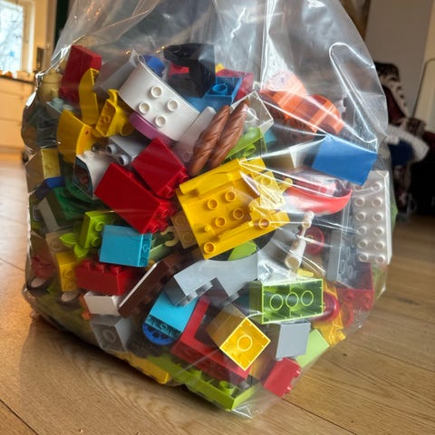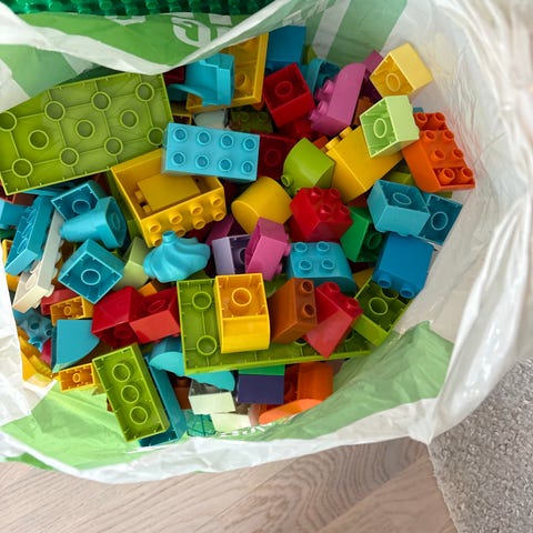 LEGO DUPLO klosser i blandede farger og ulike former. Store byggeklosser som passer for små barn. Leveres løst i pose, uten original emballasje eller spesifikt sett. Egner seg til fri bygging og kombinasjon med andre LEGO DUPLO-klosser.