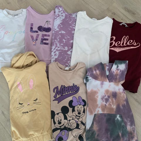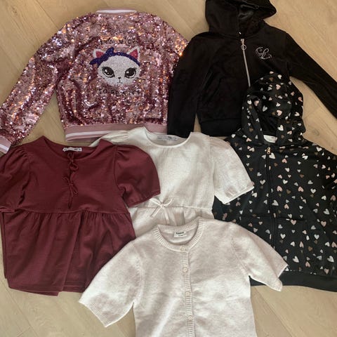 10 stk gensere til jente i str 134/140. Noen tykkere og noen tynne. Den med rosa hjerter fra lindex er i str 128, men har blitt brukt på samme tid. I god stand, men flekker kan forekomme. #gensere #jente #lindex #kappahl #nameit #HM