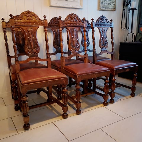 Nydelige stoler er fra rundt 1900, trolig eik. Laget i Rogaland . Fine utskjæringer og dreide ben. Behandlet og omtrukket (skinn) i 2015, noe som kostet nærmere 15,000 kr. De ble lagret etter dette.