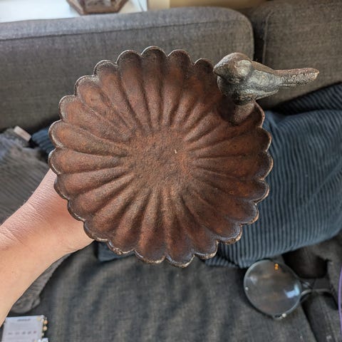 Helt ny støpejerns fuglebad eller fuglemater til å henge. Og med en fugl som pynt
