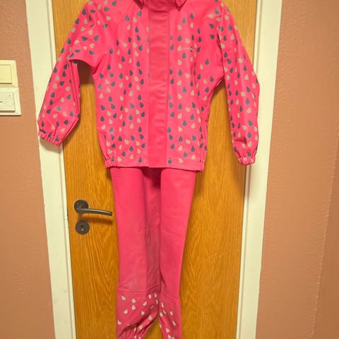 Norheim regnsett for barn i størrelse 122, beregnet for jente. Sett med jakke og bukse i rosa polyester.