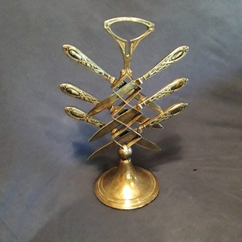 1 stk. fruktkniv-sett med teak i skaftene, og i holderen/stativet.