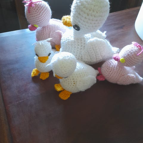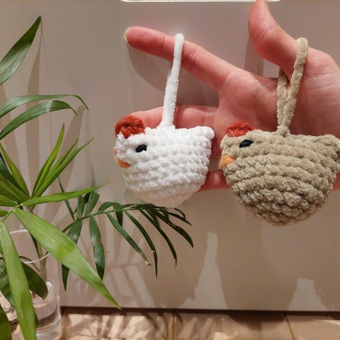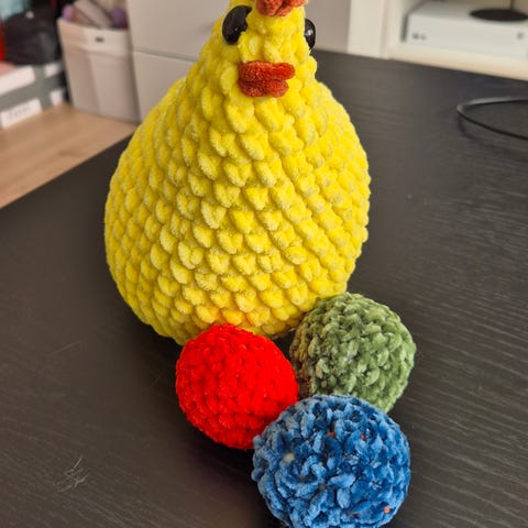 Håndlaget heklet høne formet som gryteklut i gule og hvite farger med røde detaljer. Laget i garn, egnet som gryteklut eller dekorasjon på kjøkkenet. Formen gjør at den kan henge eller ligge flatt på bord eller benk. Passer til bruk ved håndtering av varme kjeler og former, eller som pynt ved for eksempel påske og andre anledninger.