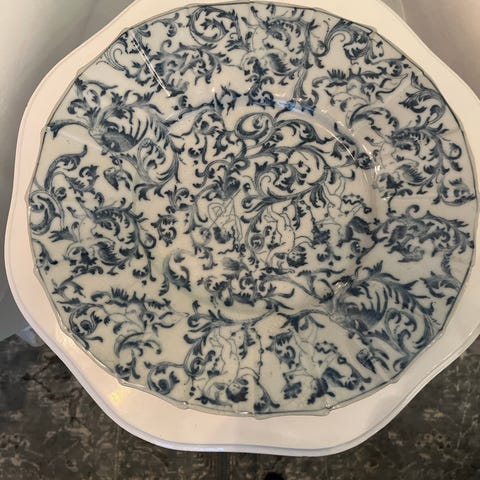 Vegghengt dekorfat med blått og hvitt blomsterinspirert mønster. Fatet har bølget kant og er egnet som veggdekor eller som dekorativt serveringsfat på bord. Passer i stue, kjøkken eller spisestue som et blikkfang i interiøret.