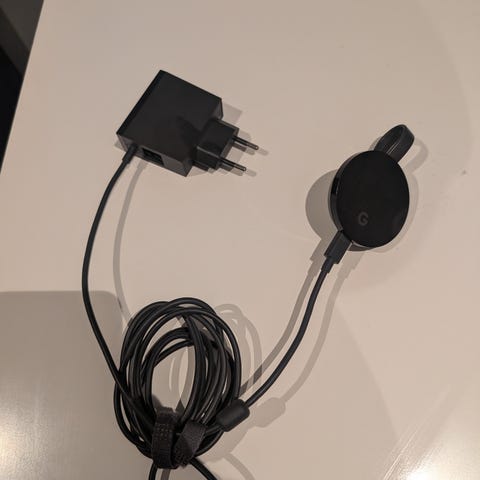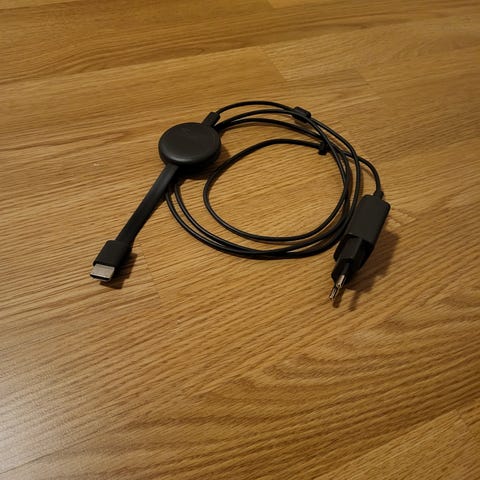 4k Google Chromecast Ultra med HDMI-tilkobling og medfølgende strømadapter i svart farge. Enheten kobles til TV via HDMI og får strøm via USB eller medfølgende strømadapter til stikkontakt. Egnet for strømming av lyd og bilde fra kompatible enheter til TV. Kabel og adapter følger med som vist på bildene.