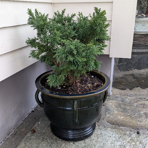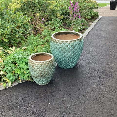 Blå potte 33 sm, med plante som altid er grønn i god stand.