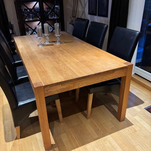 Pent brukt heltre Eik spisestue med 2 ileggsplater, samt 8 stoler. Ileggsplatene har mål 40 cm. Total lengde blir 280cm. Da er det plass til 12 personer.