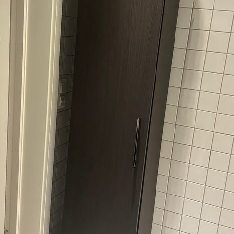 Høyt baderomsskap med flere åpne hyller bak dør. Selger fordi jeg vil kjøpe annet. Skapet er hvitt og passer til bad med begrenset gulvplass, da det utnytter høyden i rommet. Egnet til oppbevaring av håndklær, toalettsaker, rengjøringsmidler og annet baderomsutstyr. Skapet plasseres frittstående inntil vegg og kan kombineres med øvrig baderomsinnredning i lignende stil.
