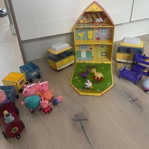 Peppa Gris lekesett med hus, buss og flere figurer. Huset har flere rom og etasjer med innredning som sofa, køyeseng og badekar, xylofon, tromme, 2 busser mm.