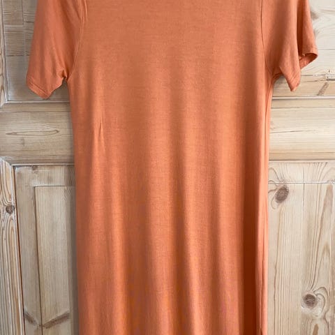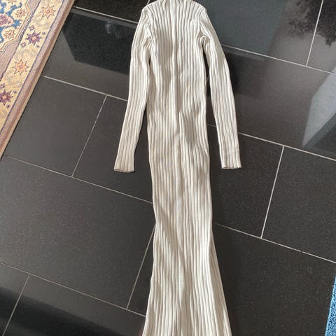 Gina Tricot hverdagskjole i størrelse XXS. Kjolen er grå og laget i bomull. Den har lange ermer, høy hals og ribbestruktur i stoffet. Modellen er ankellang med splitt nederst foran og bak. Passer som enkel hverdagskjole til dame.