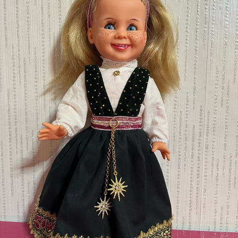 Pernilledukke i tjorven størrelse med bunadsinspirert antrekk.