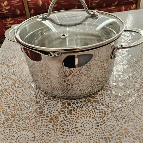 Passer til bruk på komfyrtopper som er kompatible med rustfritt stål. Størrelse og volum fremgår av bildene med målebånd og innvendige målestreker.