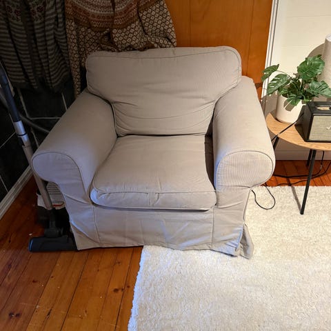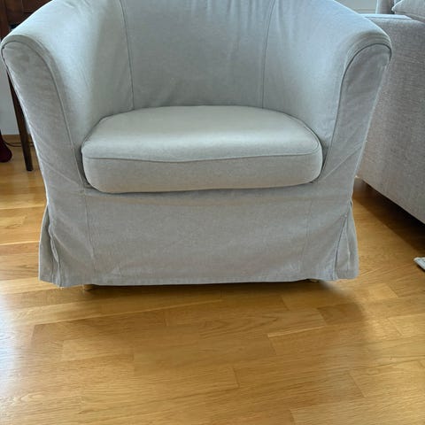 IKEA lenestol gis bort. Trekket kan tas av og vaskes, mye mulig man kan kjøpe nytt også. Noen flekker som bør gå lett av i vask, og litt slitasje i stoffet på armlenene.