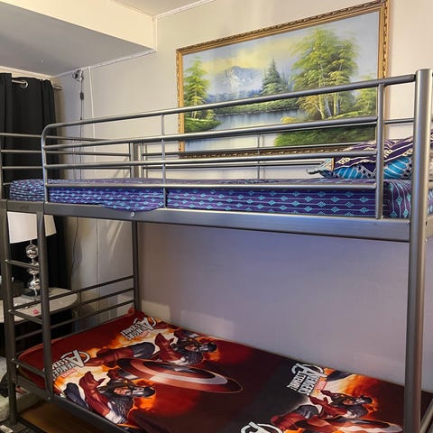 En skade bak på sengen som skjedde ved montering. Vi har ikke opplevd dette som noe problem og sikkerheten er ivaretatt