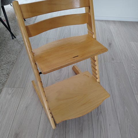 Stokke Tripp Trapp høy barnestol i tre med naturfarget finish. Stolen har justerbart sete og fotbrett som kan tilpasses barnets høyde. Egnet som spise- og sitteplass ved bord for barn. Klassisk Tripp Trapp-konstruksjon med sidevanger og tverrstag for stabilitet.