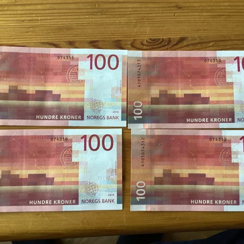 Norges Bank 100-kronersedler papirvaluta. Sedlene har motiv med vikingskip og kystlandskap i røde og oransje toner, samt pålydende verdi 100 kroner. Egner seg som norsk betalingsmiddel eller som samleobjekt for norsk valuta.