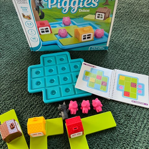 Spillet har alle brikkene, en bok og en opppgavebok.