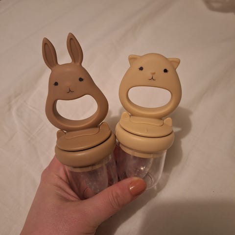 Matsmokk i silikon i fargene brun og gul. Produktet består av en ringformet holder med figurmotiv og en silikonbeholder med små hull, egnet for å gi baby myk frukt eller annen most mat på en trygg måte. Leveres med plastlokk som kan settes over silikonbeholderen for oppbevaring eller transport. Passer til spedbarn og småbarn som skal introduseres for fast føde.