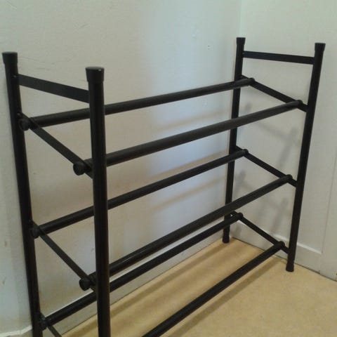 Lang skohylle, måler 280 cm lang.