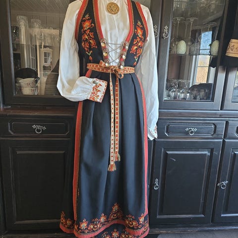 Nydelig håndbrodert Øst-Telemark damebunad med rankemønster selges. Bunaden er ikke montert.