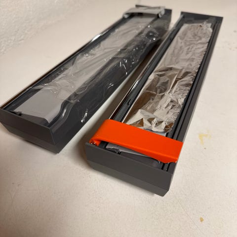 Alt av utstyr følger med, inkludert en stor sikkerhetsskyver som beskytter fingrene, utskiftbare knivblader i en praktisk oppbevaringsboks og original bruksanvisning.