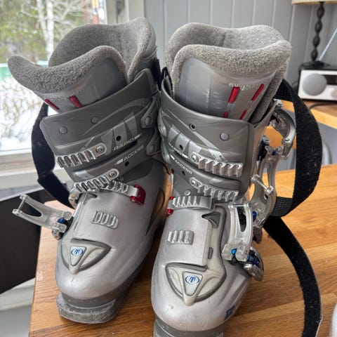 Tecnica skistøvler i oransje farge med hvite og sølvfargede spenner. Størrelse er merket 7,5 og sålelengde 305 mm. Støvlene har fire justerbare spenner og powerstrap øverst for bedre tilpasning rundt leggen. Passer til alpint bruk med standard alpinbindinger. Overdel i hardplast med polstret innersko for støtte og komfort.