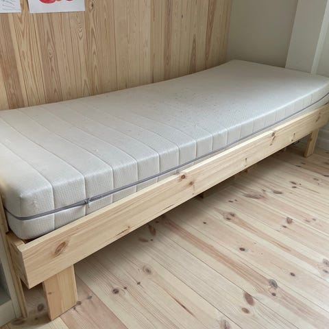 Seng i naturlig tre selges. Ny og brukt kun et par ganger. Passer til madrassstørrelse 90x200cm. Leveres uten madrass.