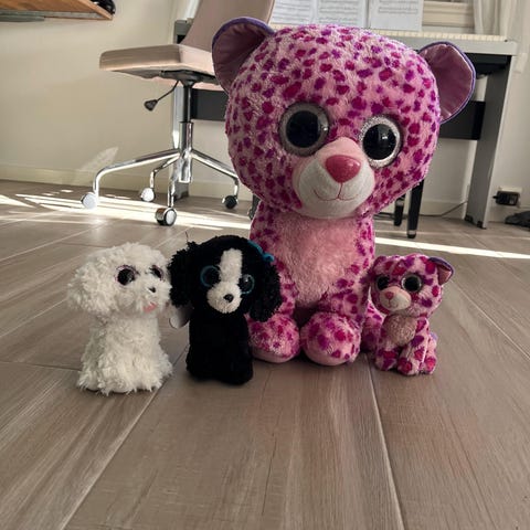 To stk TY kosedyr. Settet består av én større hund og én mindre variant med nøkkelringfeste som kan brukes som nøkkelring eller til å henge på sekk. Selges helst samlet