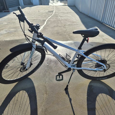 Hvit barnesykkel med 20" hjul. Sykkelen har hvit ramme med turkise detaljer, dempegaffel foran, skjermer og bagasjekurv foran. Utstyrt med flat styre, komfortsete og standard pedaler. Passer til barn som skal ha sykkel med 20-tommers hjul til bruk på vei og lett grus.