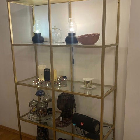 Hvit Vittsjø hylle fra IKEA selges. Hyllen har blitt spraylakkert med gullfarget bengalack.