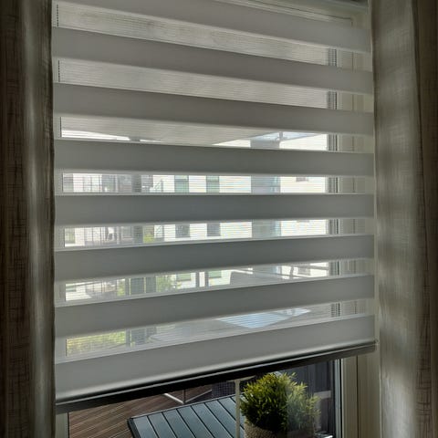 Disse er fine fordi de er fjærbelastet, dette gjør at de fremstår som ganske nøytrale. Rullegardinene slipper ikkje gjennom lys, så godt egnet til soverom