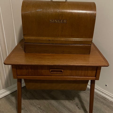 Symaskinen er en elektrisk modell fra Singer, montert i et eget sybord i tre med klaff som kan slåes opp for større arbeidsflate. Bordet har en skuff i front til oppbevaring.